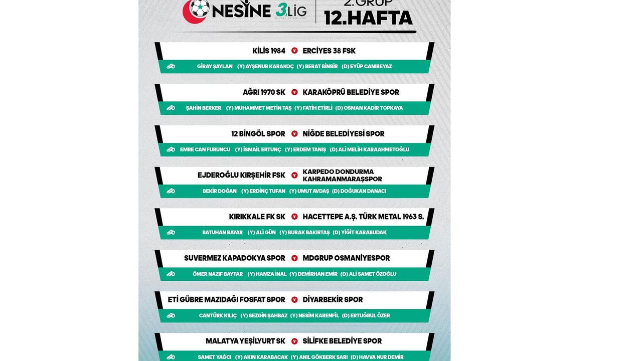 Nesine 3. Lig 2. Grup’ta 12. hafta maç programı ve karşılaşmaların hakem triosu belli oldu. Haftanın tüm mücadeleleri tek sütun halinde şöyle: