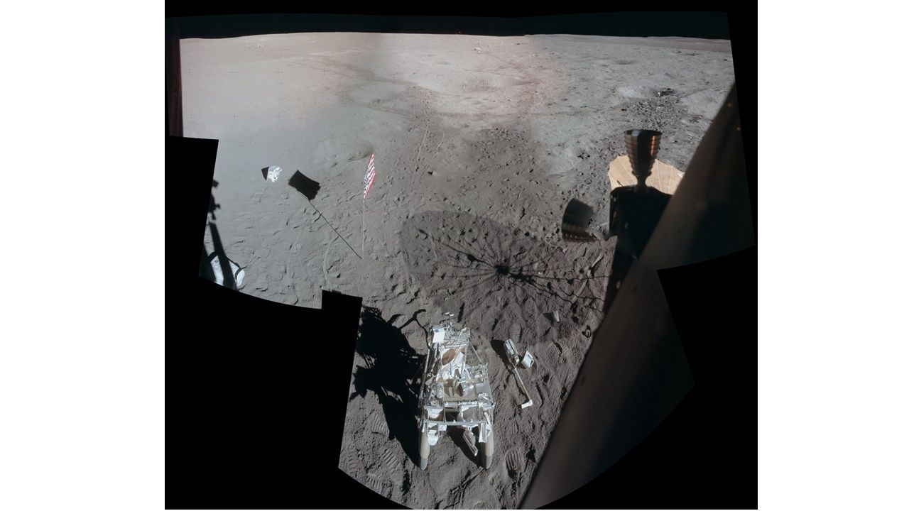 Apollo 14’ün Ay Modülü Antares, 5 Şubat 1971’de Ay yüzeyine iniş yaptı. Görev süresinin sonlarına doğru astronot Ed Mitchell, modülün penceresinden dışarı bakarak Ay yüzeyinin bir dizi fotoğrafını çekti. Bu kareler, daha sonra Apollo Lunar Surface Journal editörü Eric Jones tarafından birleştirilerek ayrıntılı bir mozaik hâline getirildi.