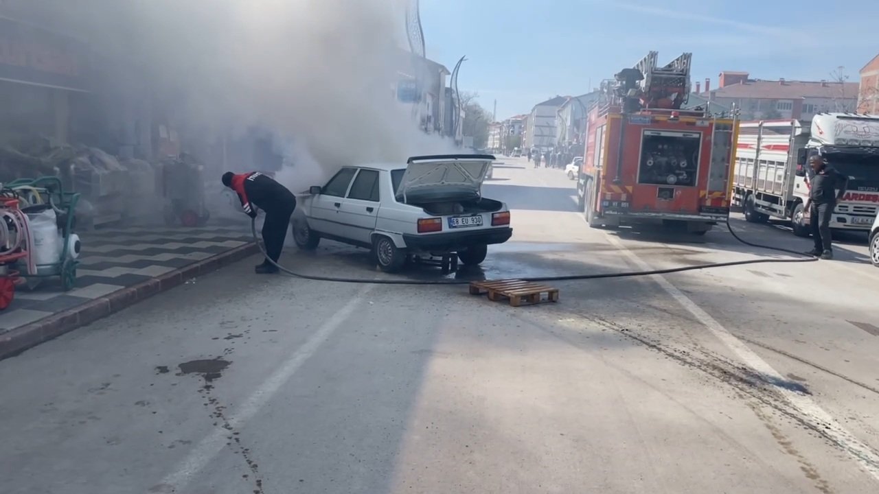 Ahmet Kaçar'ın kullandığı 68 EU 930 plakalı otomobil, Aksaray'ın Eskil ilçe merkezinde seyir halindeyken henüz belirlenemeyen nedenle alev aldı.