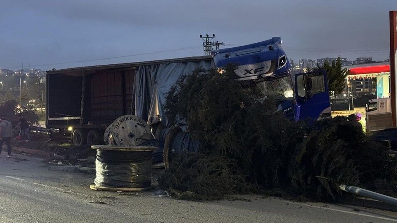 Savrulan tır, refüjdeki elektrik direğini devirdikten sonra durabildi.