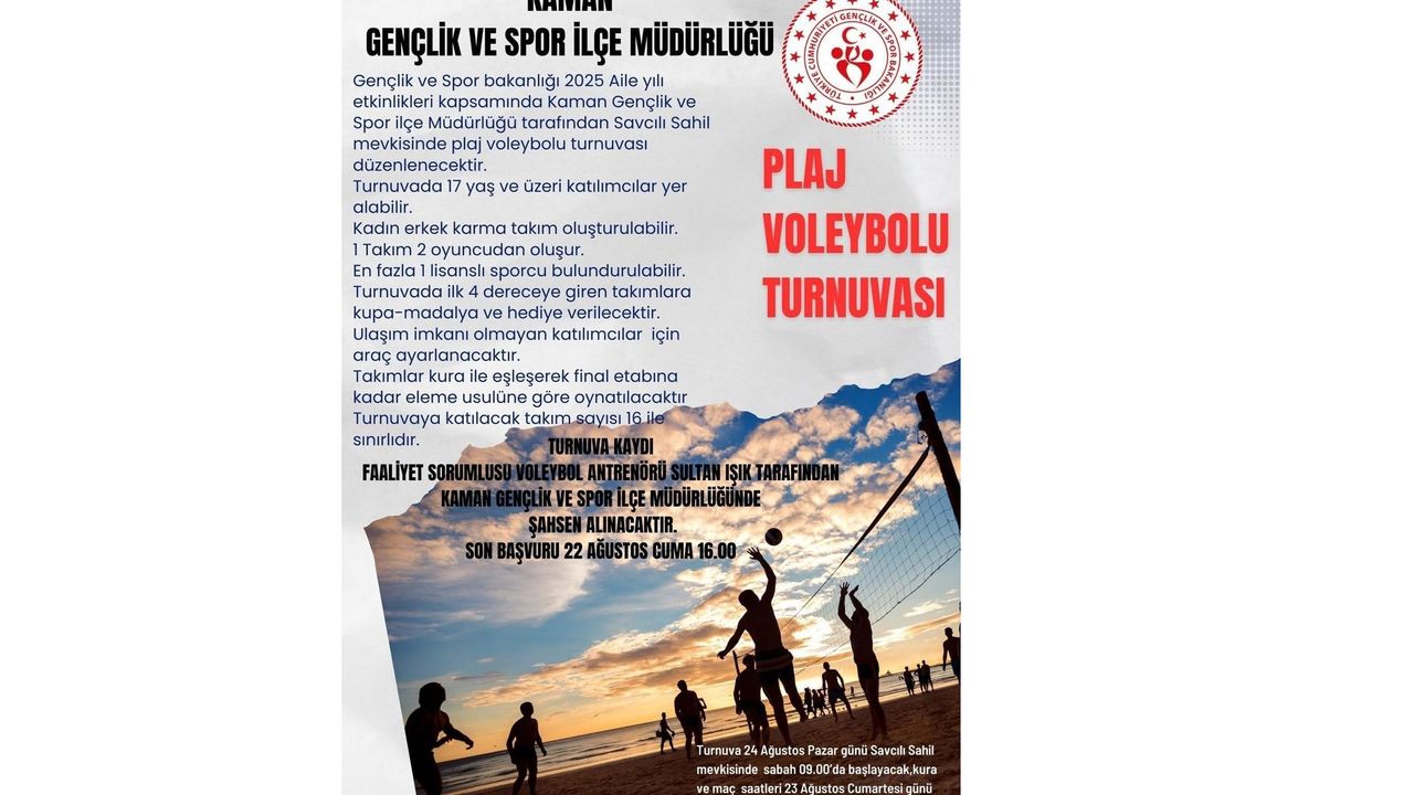 Gençlik ve Spor Bakanlığı’nın 2025 Aile Yılı etkinlikleri çerçevesinde, Kaman Gençlik ve Spor İlçe Müdürlüğü tarafından sporseverleri bir araya getirecek Plaj Voleybolu Turnuvası düzenleniyor. Kaman’ın gözde bölgelerinden Savcılı Sahil mevkiinde yapılacak turnuva, bölge halkının sporla buluşmasına ve yaz aylarının daha hareketli geçmesine katkı sağlayacak.
