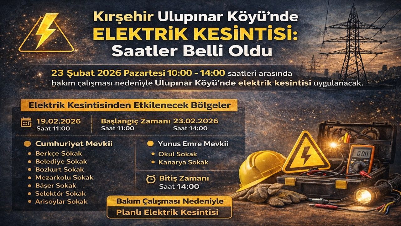 Kırşehir Merkez Ulupınar Köyü’nde 23 Şubat 2026’da planlı elektrik kesintisi uygulanacak. Cumhuriyet, İstiklal ve Yunus Emre mevkilerinde bakım çalışması nedeniyle 4 saat enerji verilemeyecek.