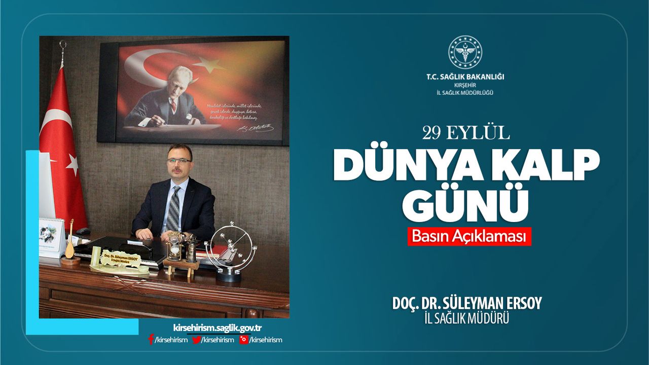 Kırşehir İl Sağlık Müdürü Doç. Dr. Süleyman Ersoy, 29 Eylül Dünya Kalp Günü dolayısıyla yaptığı açıklamada, kalp ve damar hastalıklarının hem dünyada hem de Türkiye’de en önemli ölüm nedenlerinden biri olmaya devam ettiğini vurguladı.