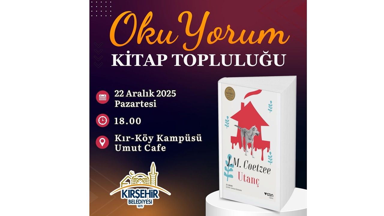 Kırşehir Belediyesi’nin düzenlediği OkuYorum Kitap Topluluğu, edebiyatseverleri yeni bir buluşmaya davet ediyor. Topluluk, 22 Aralık 2025 Pazartesi günü saat 18.00’da Kır-Köy Kampüsü Umut Cafe’de bir araya gelerek Nobel ödüllü Güney Afrikalı yazar J. M. Coetzee’nin “Utanç” adlı romanını tartışacak.