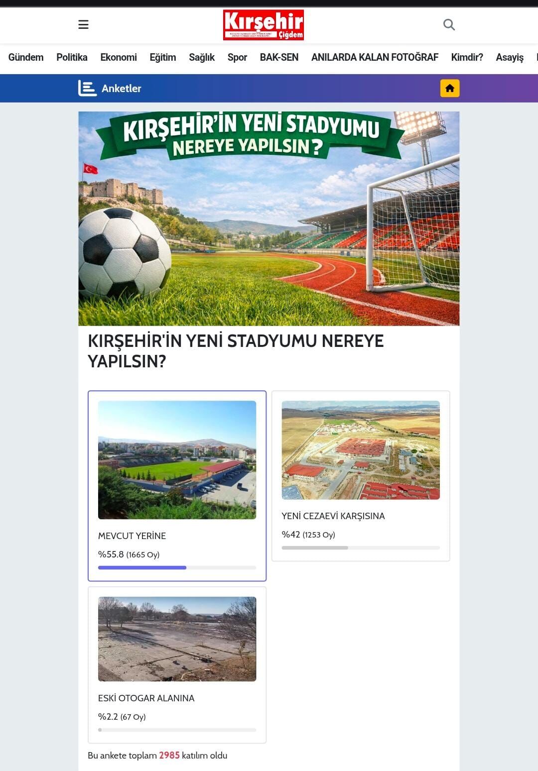 Kırşehir’de spor kamuoyunun yakından takip ettiği yeni stadyum projesi için yapılan ankete toplam 2 bin 985 kişi katıldı. Ankette vatandaşlara üç farklı seçenek sunuldu.