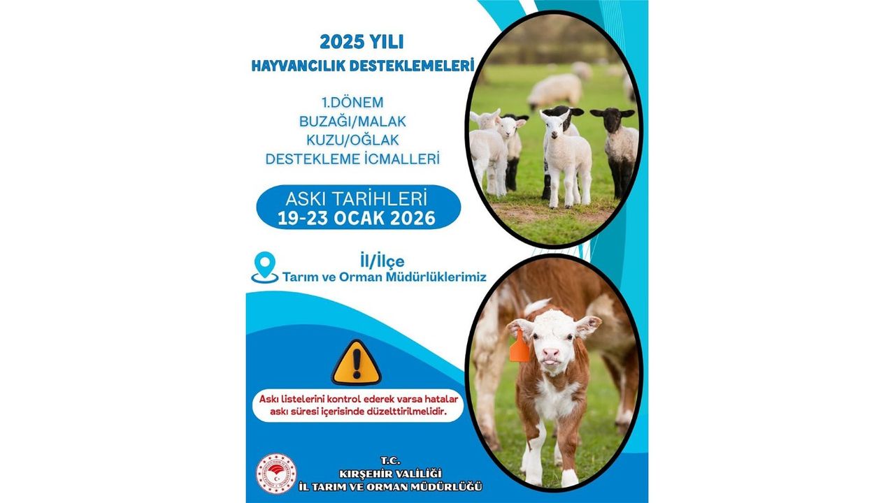 Kırşehir İl Tarım ve Orman Müdürlüğü, 2025 yılı 1. dönem buzağı/malak ve kuzu/oğlak destekleme icmalleri hakkında açıklama yaptı. Müdürlükten yapılan duyuruda, söz konusu icmallerin 19–23 Ocak 2026 tarihleri arasında İl ve İlçe Tarım ve Orman Müdürlüklerinde askıya çıkarılacağı bildirildi.