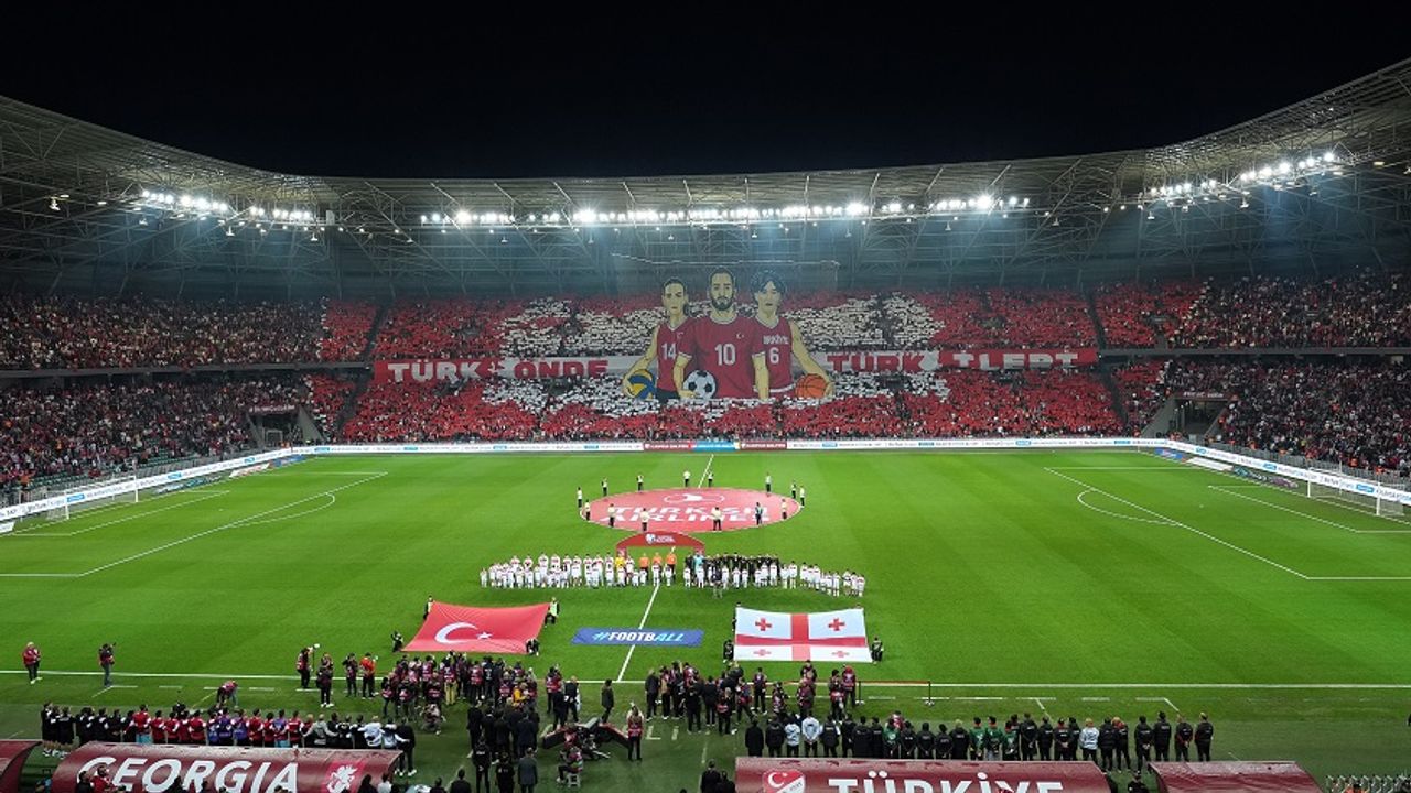 Türkiye ile Gürcistan arasında oynanan mücadele öncesinde Kocaeli Stadı tribünlerinde özel bir koreografi gerçekleştirildi. Koreografide kırmızı-beyaz renklerdeki Türkiye haritası üzerinde Kadın A Millî Voleybol Takımı Kaptanı Eda Erdem, Erkek A Millî Futbol Takımı Kaptanı Hakan Çalhanoğlu ve Erkek A Millî Basketbol Takımı Kaptanı Cedi Osman'ın görselleri sahnelendi. Görsellerin yanlarındaki pankartta da "Türk önde Türk ileri" yazısı yer aldı.