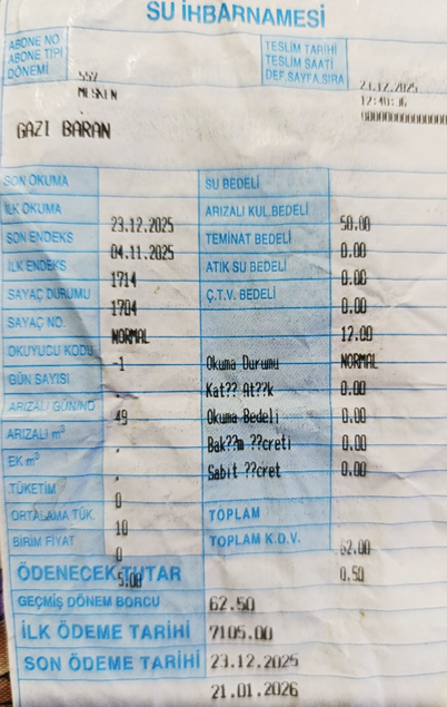 Öte yandan bir yıl önce Kurancılı Belediye Meclisi bir karar alarak yenilenen su isale hattına abonelerin su bağlantılarının yenilenmesi işi için belediye bu asli görevini ihaleye verip abone başına 6000 lira mevcut şebeke tesislerinin tevsii ve ıslahından dolayı Su Tesisleri Harcamalarına Katılma Payı adı altında su ihbarnamesine “geçmiş dönem borcu” çıkarmıştır. Bu karar alınmadan önce ne vatandaşa danışılmış ne de görüşü alınmıştır. İşin tuhafı vatandaşça yüksek bulunan 6000 liraya ödenmeyen her ay için gecikme zammı uygulanmış yanda görüldüğü gibi 21.12.2025 tarihinde bu rakam 7105 liraya yükselmiştir. Bu rakamın ödenirliği bir yana yasallığı da tartışmalıdır. Kurancılı Belediye yönetimi olası itirazları frenlemek ya da abonelerini bilgilendirmek için ilan panosuna Çevre, Şehircilik ve İklim Değişikliği Bakanlığının Valiliklere gönderdiği konusu (Görüş) Katkı Payları Hk. olan 23.5.2023 tarih 7118846/622.02/6458640 sayılı 6 sayfalık yazıda belediyelerin su tesisi harcamalarına katılma payı alabileceği, payın üst sınırının Harcamalara Katılma Payı bina ve arsalarda vergi değerinin % 2’sini geçmeyeceği vergi değerinin de emlak vergisi mevzuatına göre belirleneceği yolunda görüş bildirilmiştir.