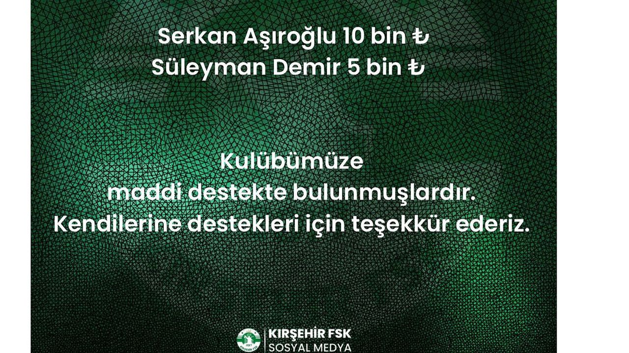 Kırşehir FSK yönetimi, yapılan bağışın ardından yayınladığı teşekkür mesajında şu ifadelere yer verdi: “Şehrimizin takımına yürekten bağlı hemşehrilerimizin destekleri, bize yalnız olmadığımızı gösteriyor. Maddi katkılar, sadece bir bütçe desteği değil, aynı zamanda moral ve motivasyon kaynağıdır. Serkan Aşiroğlu ve Süleyman Demir’e bu anlamlı destekleri için gönülden teşekkür ediyoruz.”