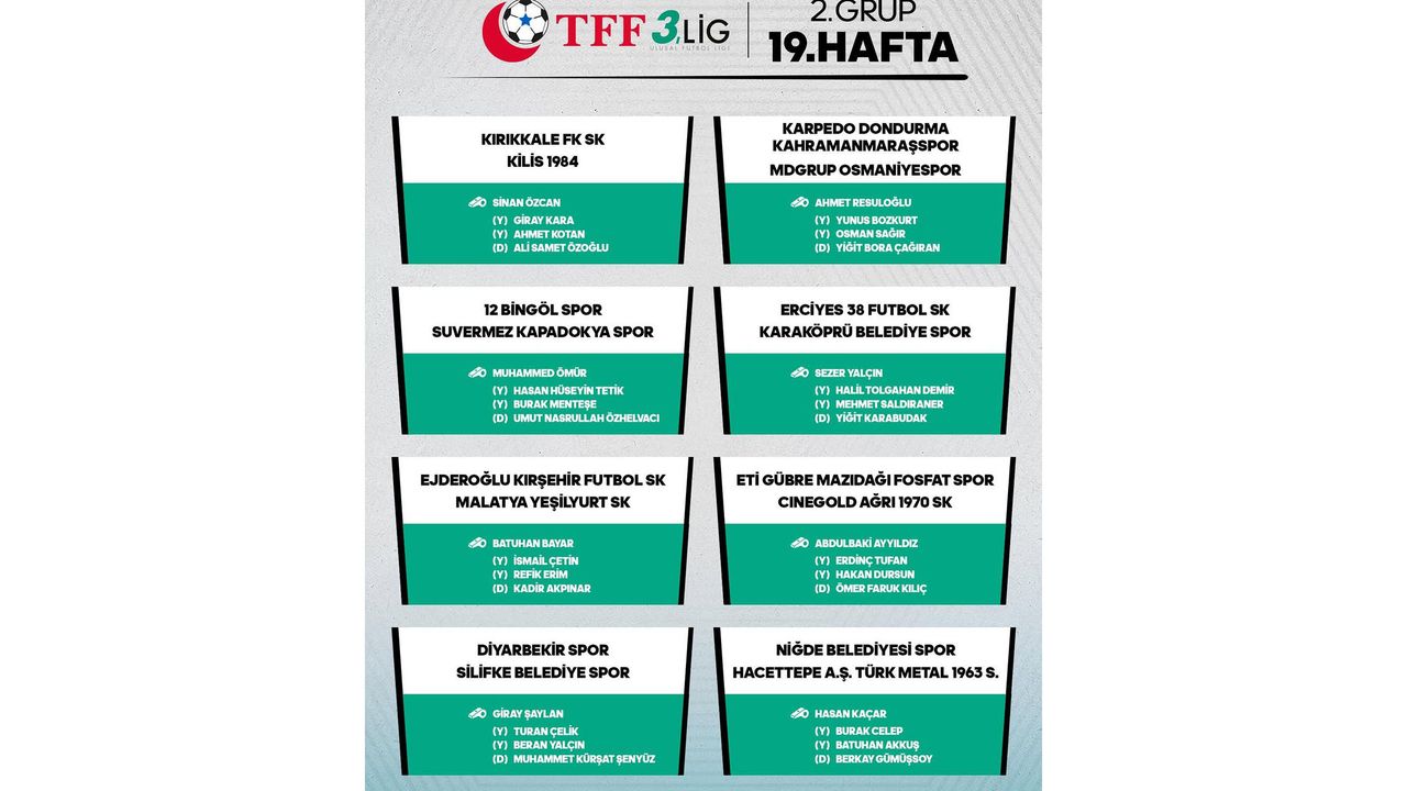 Türkiye Futbol Federasyonu 3. Lig 2. Grup’ta 19. hafta karşılaşmalarında görev yapacak hakem triyoları Türkiye Futbol Federasyonu tarafından açıklandı.