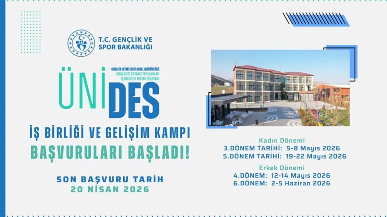 Gençlik ve Spor Bakanlığı Gençlik Hizmetleri Genel Müdürlüğü tarafından yürütülen Üniversite Öğrenci Toplulukları İş Birliği ve Destek Programı (ÜNİDES), üniversite öğrencilerine yönelik yeni bir fırsatı daha hayata geçiriyor. Program kapsamında düzenlenen İş Birliği ve Gelişim Kampları için başvurular başladı.