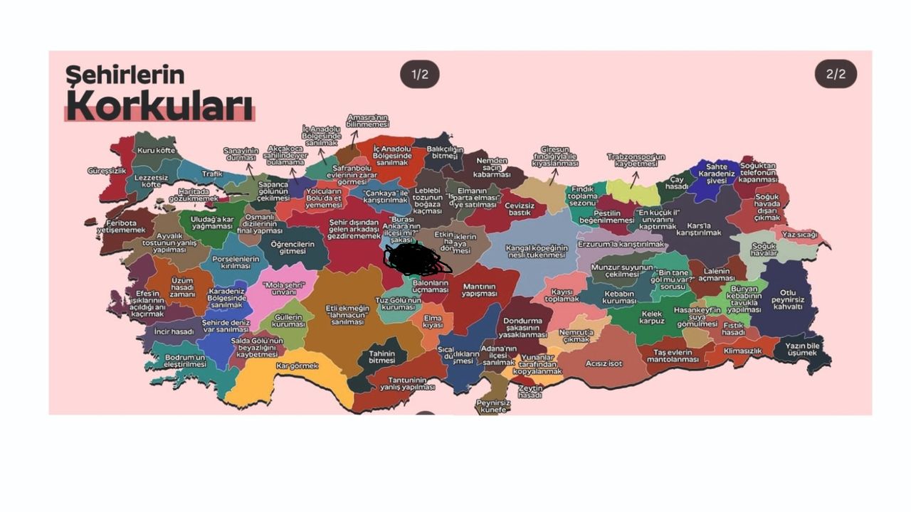 Sosyal medyada hızla yayılan ve yapay zekâ tarafından oluşturulan “şehirlerin korkuları” haritası, Türkiye’nin kültürel kimliğini mizahi ve duygusal bir dille yorumladı. Her ilin kendine özgü korkusunu yansıtan bu dijital araştırma, kullanıcıların yoğun ilgisiyle viral hale geldi.