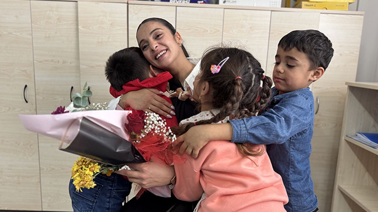 Hatay'da depremde yıkılan binanın enkazından 46 saat sonra yaralı kurtarılan okul öncesi öğretmeni Sena Alkan, bu yıl göreve başladığı anaokulunda öğrencileri tarafından çiçekle karşılandı.