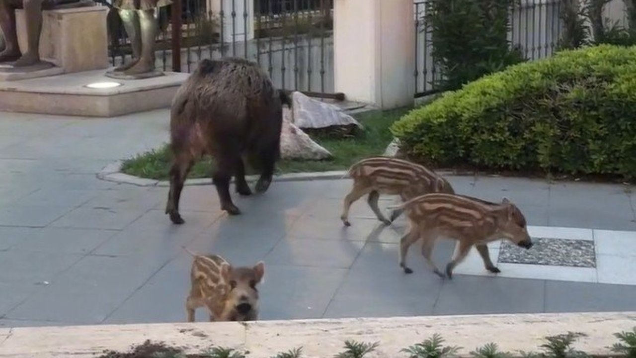 Görüntülerde, yaban domuzlarının bahçelerin ve çöp konteynerlerinin çevresinde yiyecek araması, bazı kişilerin yiyecek atması ve hayvanların bir süre sonra ormanlık alana girerek gözden kaybolması yer alıyor.
