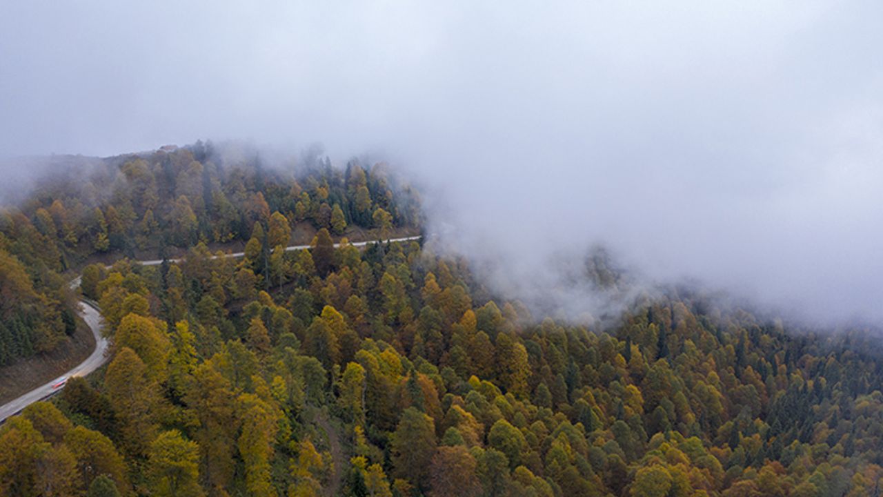 Bolu'nun doğal güzellikleriyle ünlü Yedigöller Milli Parkı yolunda etkili olan sis dronla görüntülendi. Sonbahar mevsiminde yeşil, kahverengi ve sarı tonlarla kaplanan Yedigöller Milli Parkı'na ulaşım sağlanan yolda güzel manzaralar oluşuyor.