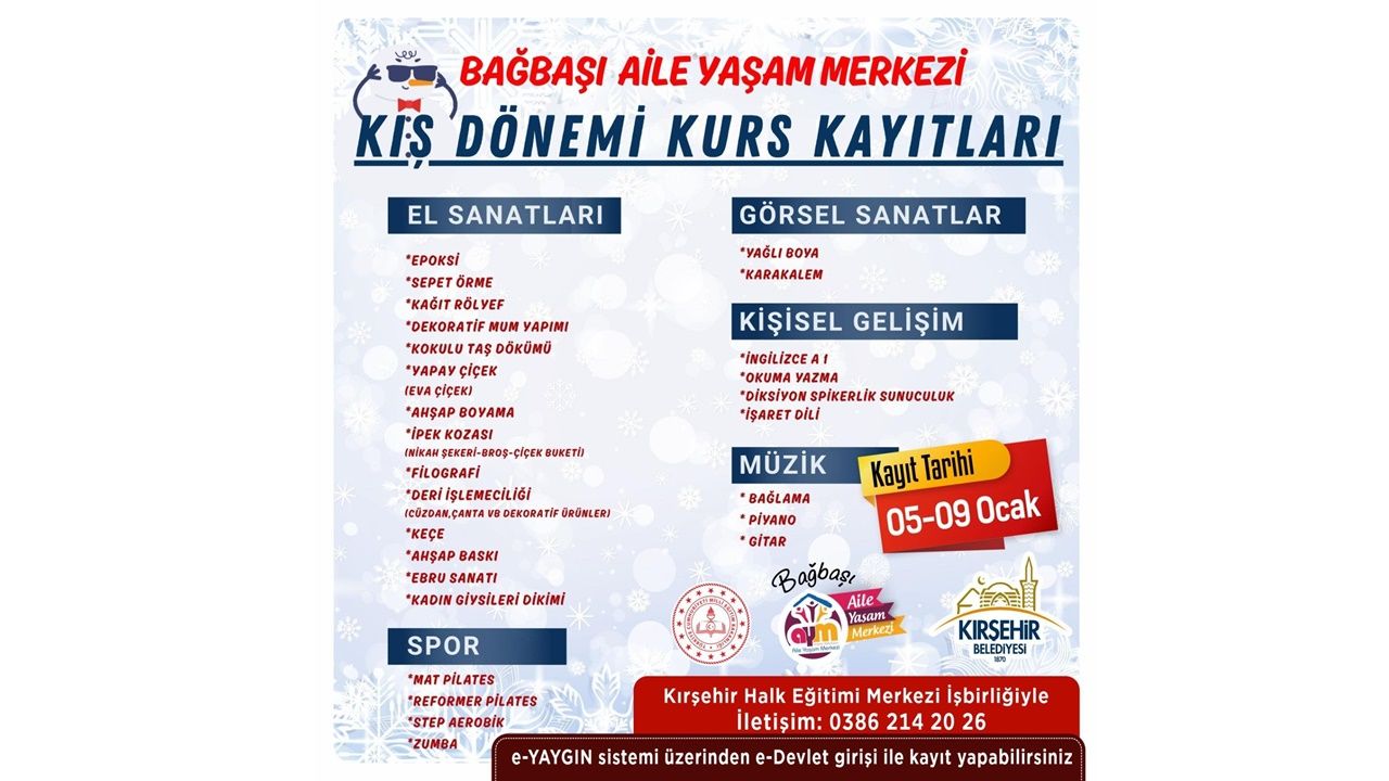 Kırşehir Belediyesi, vatandaşların sosyal ve kültürel gelişimine katkı sağlamak amacıyla Bağbaşı Aile Yaşam Merkezi’nde düzenlenecek kış dönemi kurslarının kayıt tarihlerini duyurdu.