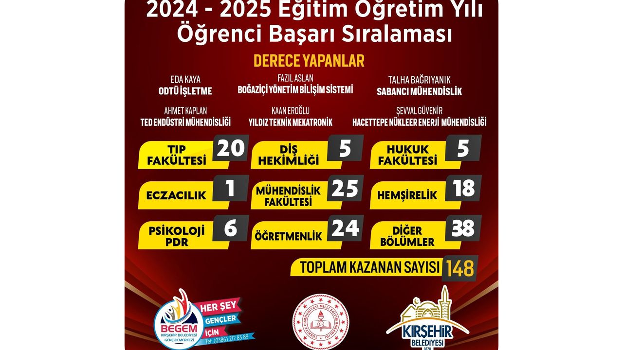 25 Ağustos 2025 tarihinde YKS Tercih Sonuçlarının açıklanmasıyla birlikte Kırşehir’de gurur tabloları açıklanıyor. Kırşehir Belediyesi Gençlik Merkezi (BEGEM) YKS Tercih Sonuçları kapsamında 148 öğrencinin üniversitelere yerleştiğini paylaştı.