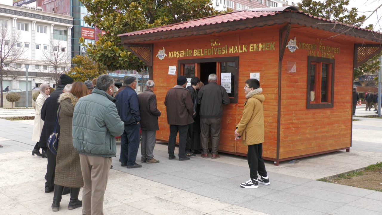 Kırşehir’de Öğlen saatlerinde halk ekmek büfesi önünde yoğunluk oluştu. Uygun fiyatlı ekmek almak isteyen vatandaşlar, büfe önünde uzun kuyruklar oluşturdu.