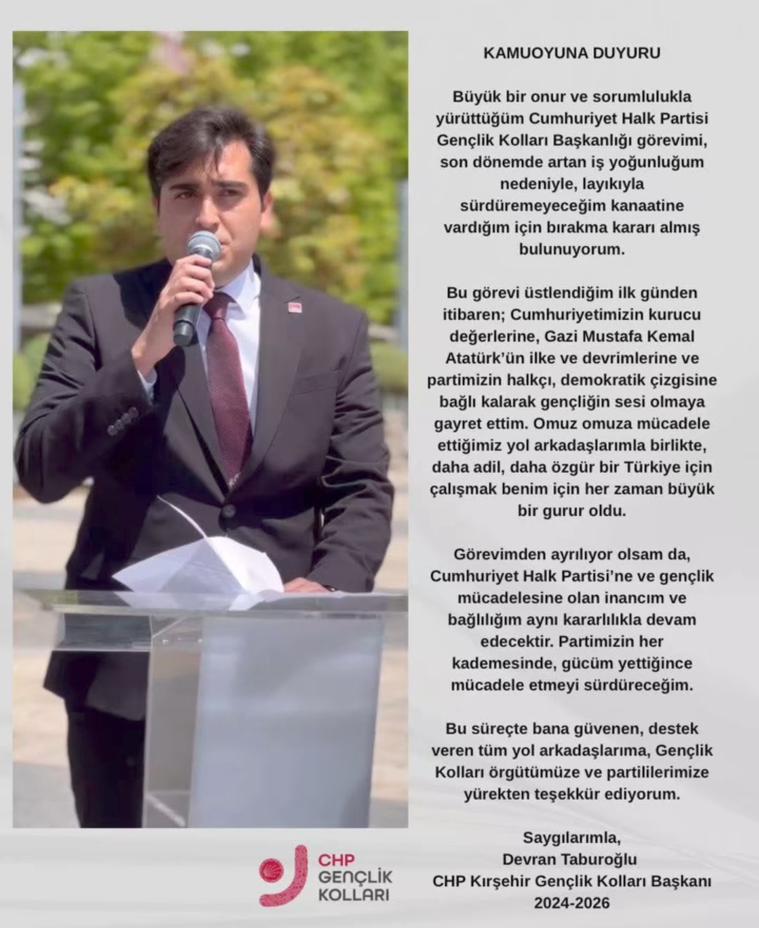 Cumhuriyet Halk Partisi (CHP) Kırşehir Gençlik Kolları Başkanı Devran Taburoğlu, görevinden ayrıldığını kamuoyuna yaptığı yazılı açıklama ile duyurdu.