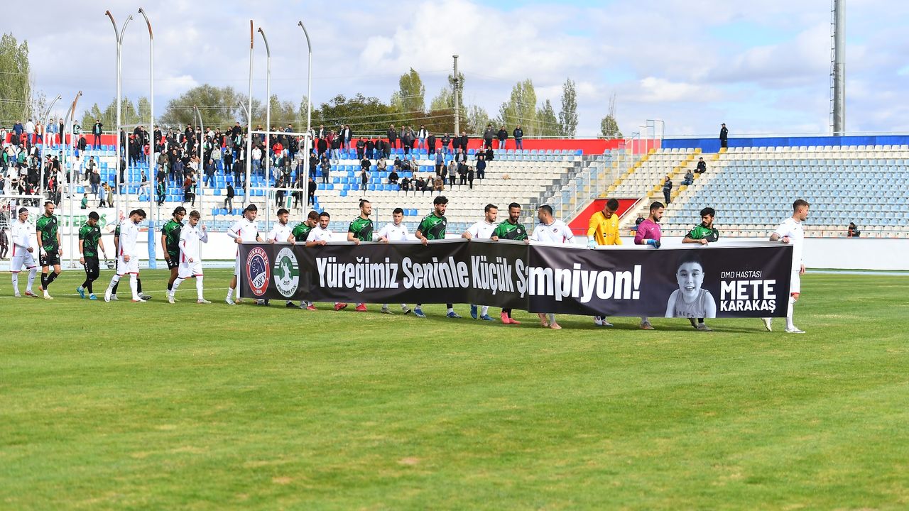 Karşılaşma öncesi her iki takım oyuncuları, “Yüreğimiz seninle küçük şampiyon DMD Hastası Mete Karakaş” yazılı pankartla sahaya çıktı.