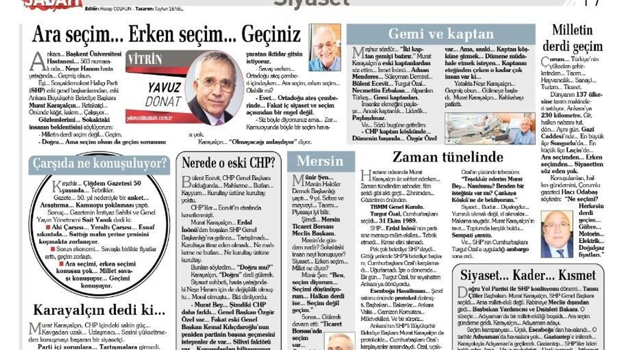 “Ara seçim... Erken seçim... Geçiniz” başlıklı yazıda “Çarşıda Ne Konuşuluyor?” ara başlıklı kısımda Kırşehir Çiğdem Gazetesi İmtiyaz Sahibi Sait Yanık’ın ifadelerine vurgu yaptı. Yavuz Donat, “Ahi Çarşısı... Yeraltı Çarşısı... Esnaf sıkıntıda... Sattığı malın yerine yenisini koymakta zorlanıyor. Sorun ekonomi... Savaşla birlikte fiyatlar arttı, geçim zorlaştı. Ara seçimi, erken seçimi konuşan yok... Millet savaşı konuşuyor... Geçimi konuşuyor” ifadelerine yer verdi.