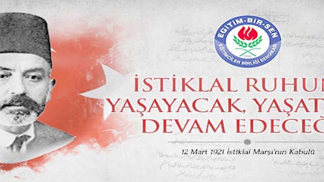 “Eğitim-Bir-Sen olarak, İstiklal Marşı’nın kabulünün 96. yılı ve Mehmet Akif Ersoy’u anma gününde İstiklal şairinin ve marşının canlı tutmak istediği ruhu yaşayacak, yaşatmaya devam edeceğiz. İstiklal Marşı’nın TBMM’de millî marş olarak kabul edilişinin 96. yılında, milletimizi İstiklal Marşı’nın yazıldığı kaotik ortamlara sokmaya çabalayanlara fırsat vermeyeceğimizi ifade ediyor, bütün Milli Mücadele şehitlerimizi ve Milli Şairimiz Mehmet Akif Ersoy’u rahmet ve minnetle anıyoruz.”