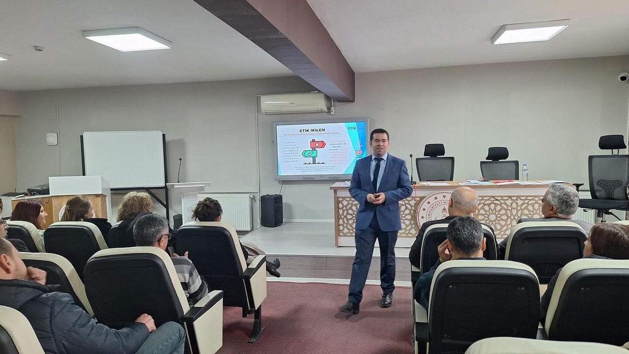 Eğitim Müfettiş Yardımcısı ve Etik Eğiticisi Mehmet Mesut Oğuz tarafından verilen seminerler, katılımcılara etik kavramının tanımı, kamu görevlilerinin uyması gereken etik ilkeler, öğretmenlik meslek etiği, sosyal medya etik ilkeleri, etik sorunlarla baş etme yöntemleri ve etik karar verme süreçleri hakkında kapsamlı bilgiler sundu. Ayrıca, Kamu Görevlileri Etik Kurulu'nun görevleri ve sorumlulukları da detaylı bir şekilde ele alındı.