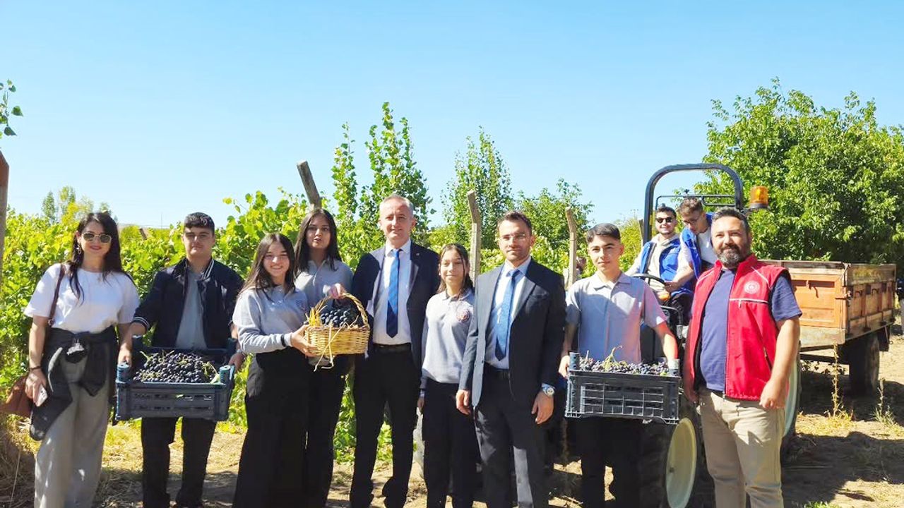 İlçe Milli Eğitim Müdürlüğü Uygulama Bahçesi'nde gerçekleştirilen etkinlikte, ÇEDES (Çevreme Duyarlıyım, Değerlerime Sahip Çıkıyorum) projesi paydaşları ve gönüllü gençler üzüm hasadı yaptı.