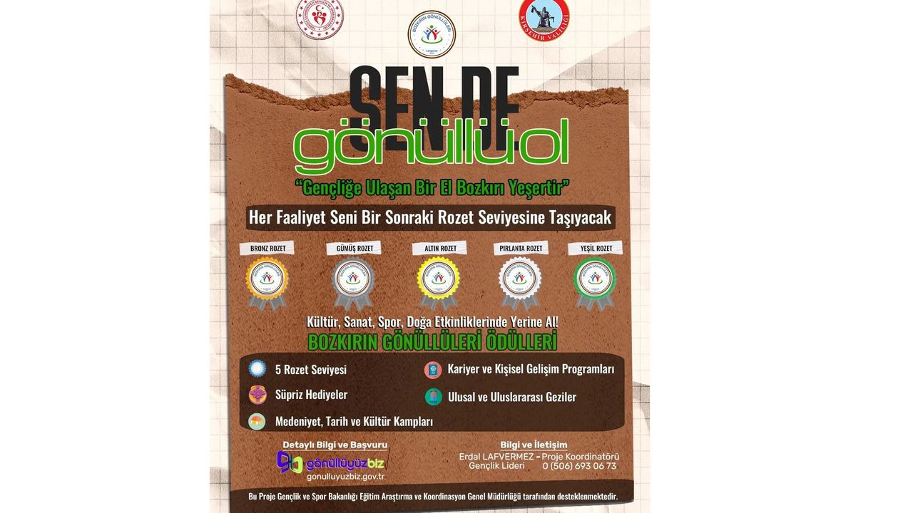Kırşehir Gençlik ve Spor İl Müdürlüğü, gençleri kültür, sanat, spor ve doğa odaklı etkinliklerle bir araya getiren “Bozkırın Gönüllüleri” projesini başlattı. Proje, gençlerin sorumluluk bilincini artırmayı ve gönüllülük kültürünü yaygınlaştırmayı hedefliyor.