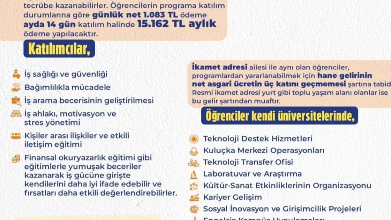 İŞKUR tarafından yürütülen program, gençlerin iş deneyimi kazanmasını, mesleki becerilerini geliştirmesini ve sosyal hayata aktif katılımını amaçlıyor. Başvurular İŞKUR’un resmi web sitesi üzerinden veya ALO 170 hattı aracılığıyla yapılabiliyor. Programın, genç istihdamına katkı sunması ve iş gücü piyasasına hazırlık sürecini desteklemesi bekleniyor.
