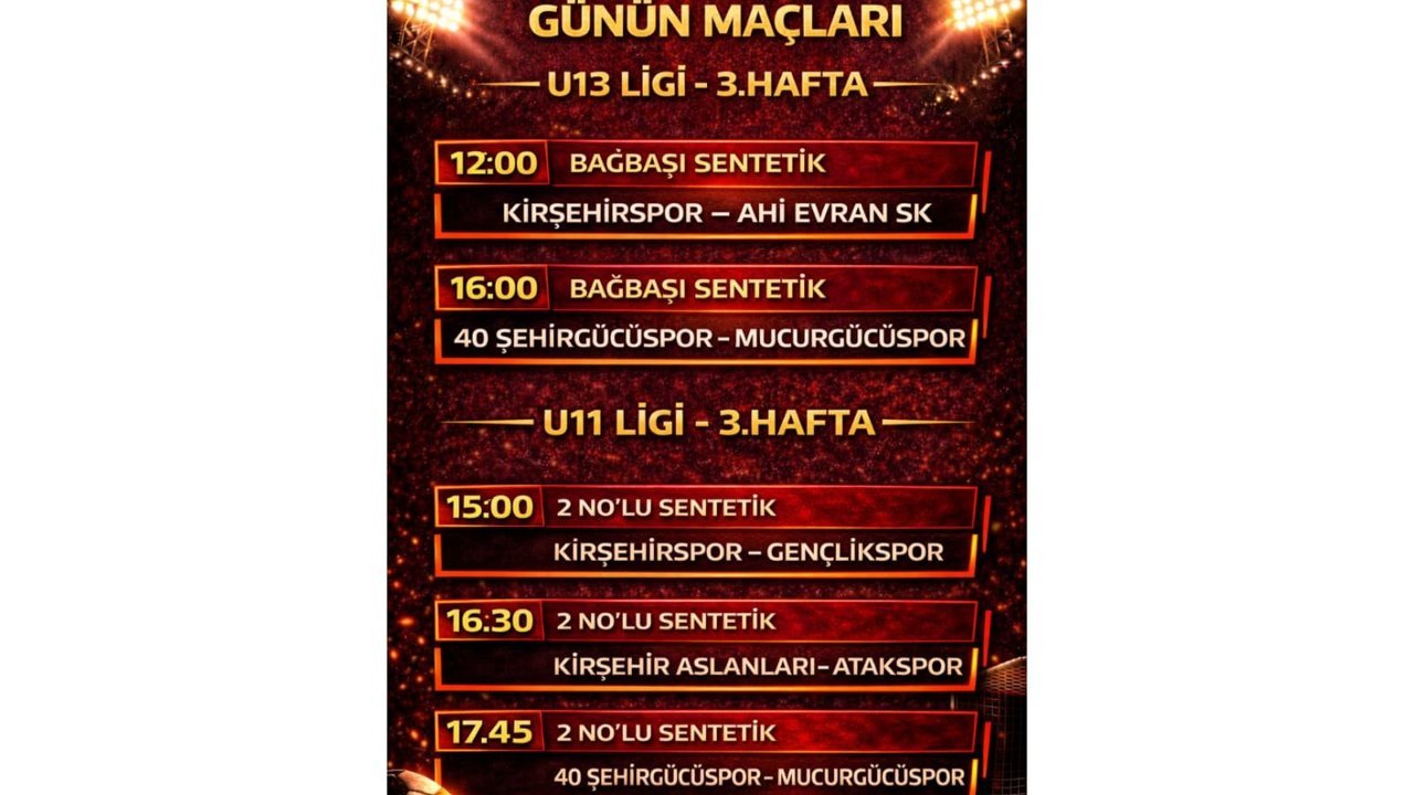 Kırşehir’de altyapı futbolunun önemli organizasyonlarından U13 ve U11 liglerinde 3. hafta karşılaşmaları bugün oynanacak. Bağbaşı ve 2 No’lu Sentetik sahalarda gerçekleşecek müsabakalarda genç yetenekler sahaya çıkacak.