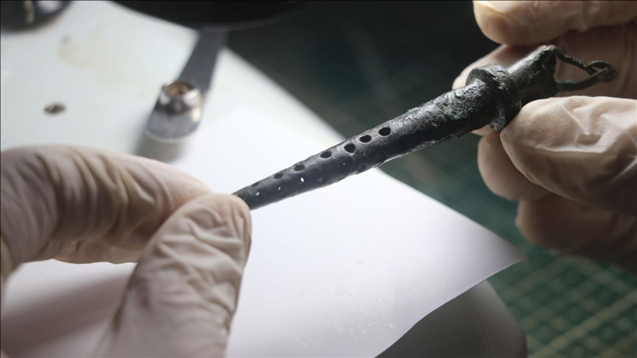 Kazı çalışmalarında arkeolojik açıdan önemli bulgu ve buluntulara rastladıklarını belirten Çelikbaş, "Bu buluntulardan biri de bronz bir obje. Bu bronz objenin antik dönemde filtre olarak kullanıldığını tespit ettik. Bu, antik dönemde insanların içeceklerini filtreleyen, daha konforlu bir şekilde içmelerini sağlayan obje." dedi.