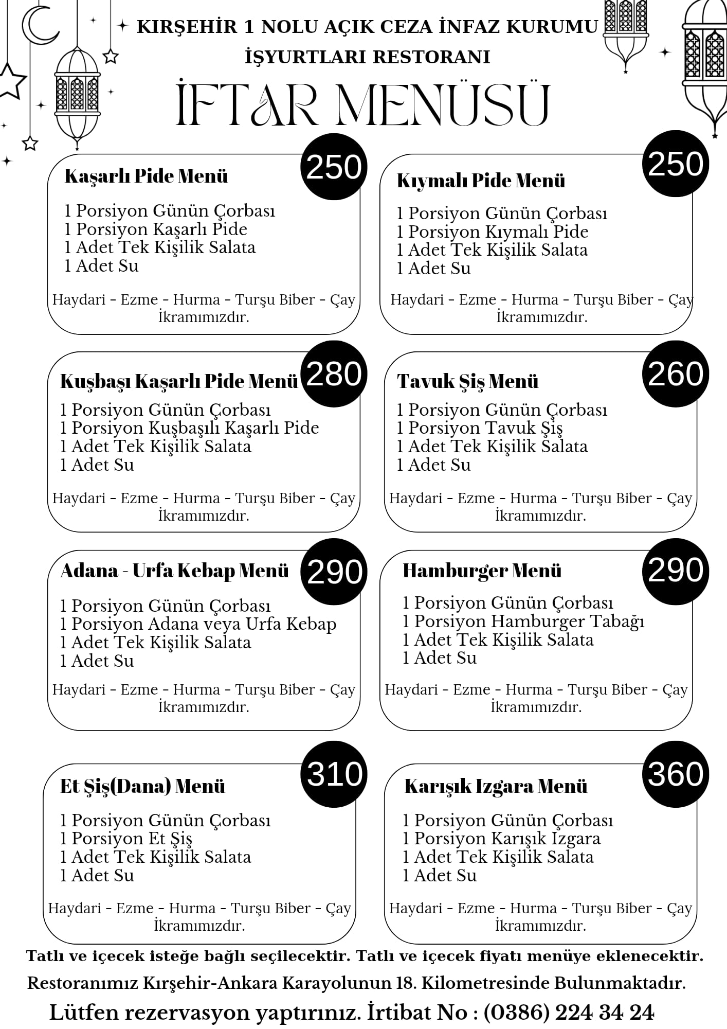 Bu ramazan ayında, lezzetli ve doyurucu bir iftar için Kırşehir 1 Nolu Açık Ceza İnfaz Kurumu İşyurtları Restoranı'nda yerinizi ayırtın!