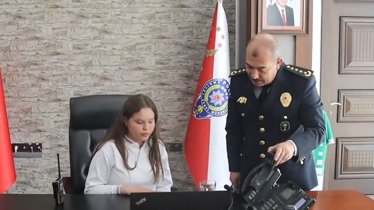 Kırşehir İl Emniyet Müdürü Erdoğan Kartal, 23 Nisan Ulusal Egemenlik ve Çocuk Bayramı dolayısıyla makam koltuğunu TOKİ Şehit Gökhan Emre Örül İmam Hatip Ortaokulu öğrencisi Buse Naz Çopur 'a bıraktı.