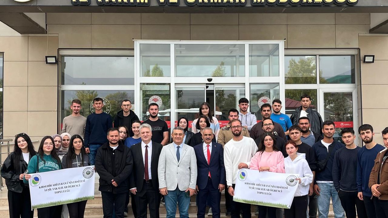 Kırşehir Ahi Evran Üniversitesi bünyesinde faaliyet gösteren Yeşil Yakalılar Öğrenci Topluluğu üyeleri, Kırşehir İl Tarım ve Orman Müdürlüğü’nü ziyaret etti. Gerçekleştirilen ziyarette öğrenciler, İl Müdürü Bülent Zafer Taş ile bir araya gelerek tarım ve çevre alanındaki güncel çalışmalar hakkında bilgi aldı.