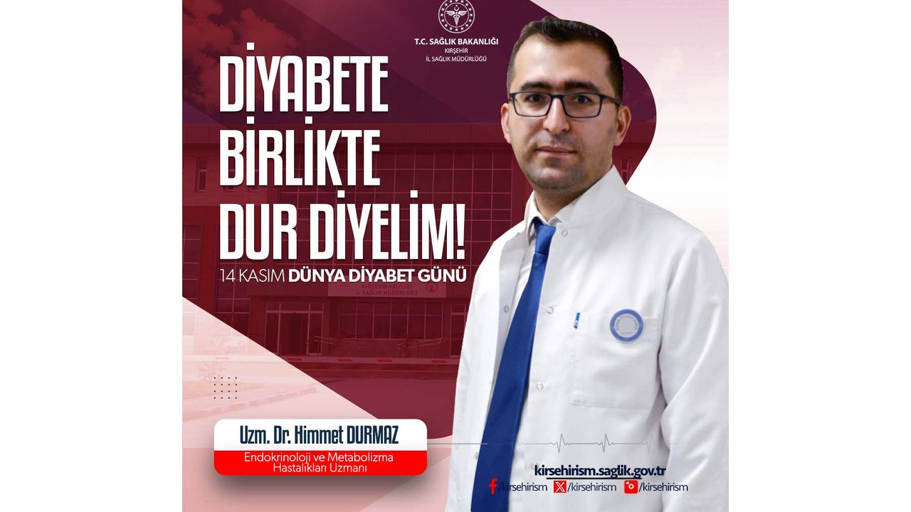 Kırşehir Eğitim ve Araştırma Hastanesi Endokrinoloji ve Metabolizma Hastalıkları Uzmanı Dr. Himmet Durmaz, 14 Kasım Dünya Diyabet Günü dolayısıyla yaptığı açıklamada diyabetin önlenebilir ve kontrol altına alınabilir bir hastalık olduğunu vurguladı. Dünya Diyabet Günü her yıl 14 Kasım tarihinde tüm dünyada diyabet hakkında farkındalık oluşturmak amacıyla kutlanmaktadır. 2025 yılının teması ise “Diyabet ve Esenlik” olarak belirlenmiştir. Diyabetin kontrolünün kişinin kendi elinde olduğunu belirten Dr. Himmet Durmaz, diyabetin halk arasında bilinen adıyla şeker hastalığının çağın en önemli sağlık sorunlarından biri olduğunu ifade etti. Dr. Himmet Durmaz yapmış olduğu açıklamada erken tanı, düzenli takip ve sağlıklı yaşamla diyabetin olumsuz etkilerinden korunmanın mümkün olduğuna dikkat çekti.