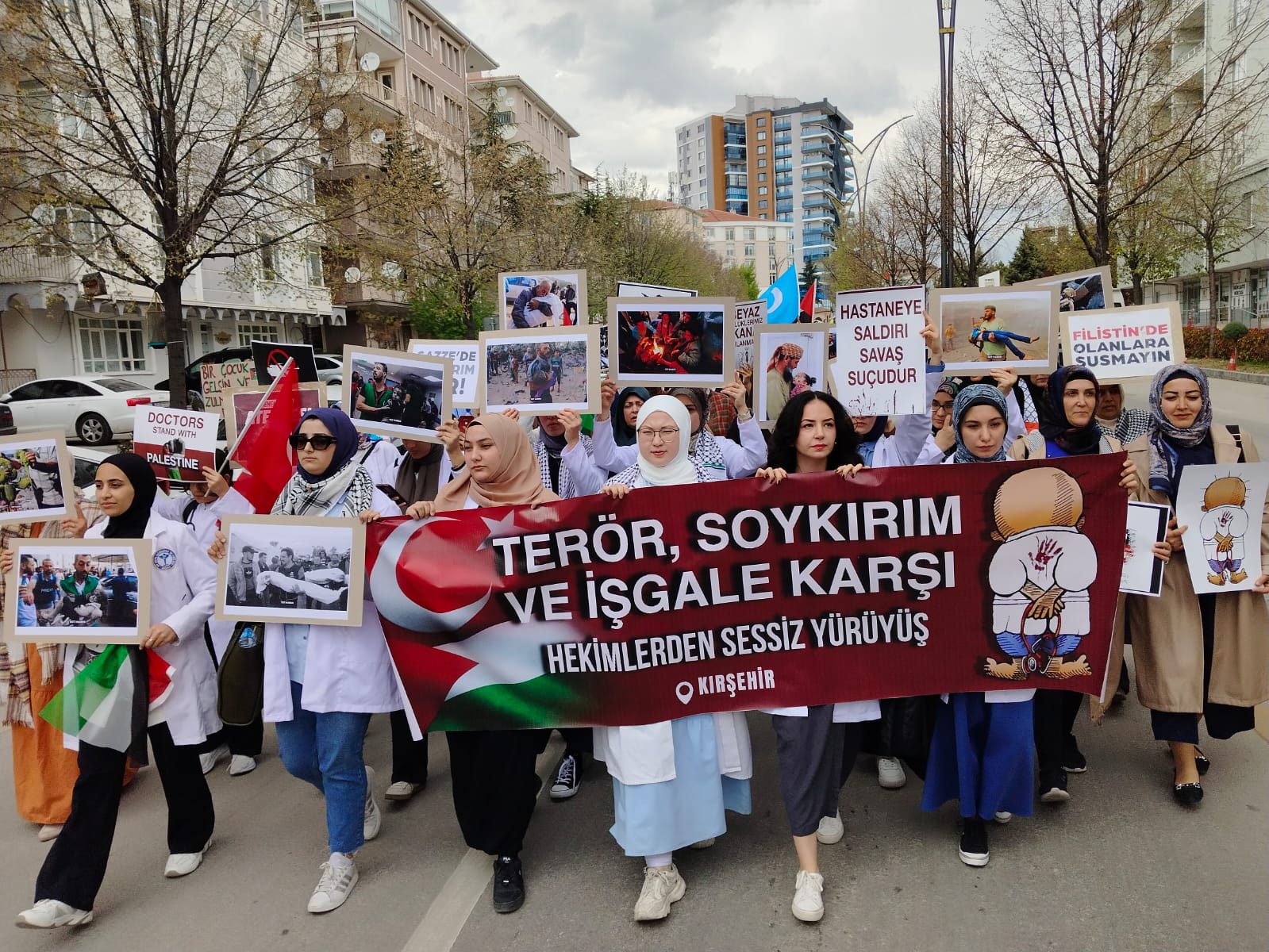 Kırşehir’de hekimler Gazze'de yaşanan olaylara dikkat çekmek amacıyla 'Sessiz Yürüyüş' eylemi yaptı. Kırşehir merkez Askerlik Şubesi kavşağında buluşan hekimler Cacabey Meydanı'na kadar yürüdü.