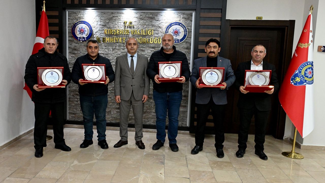 Kırşehir İl Emniyet Müdürü Dr. Mesut Görücü emekliye ayrılan Polis Memurları Musa Ergül, Ali Aydemir, Hayati Tasan, Halit Minar ve Levent Çaykara ile bir araya gelerek plaket ve teşekkür belgesi taktim etti.