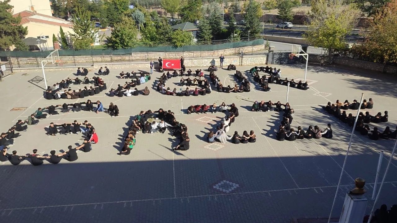 Etkinliğe katılan 280 öğrenci, okul bahçesinde belirlenen düzende yer alarak vücutlarıyla dev harflerle “Özgür Gazze” yazdı. Havadan drone ile görüntülenen bu anlamlı kare, kısa sürede sosyal medya platformlarında gündem oldu.