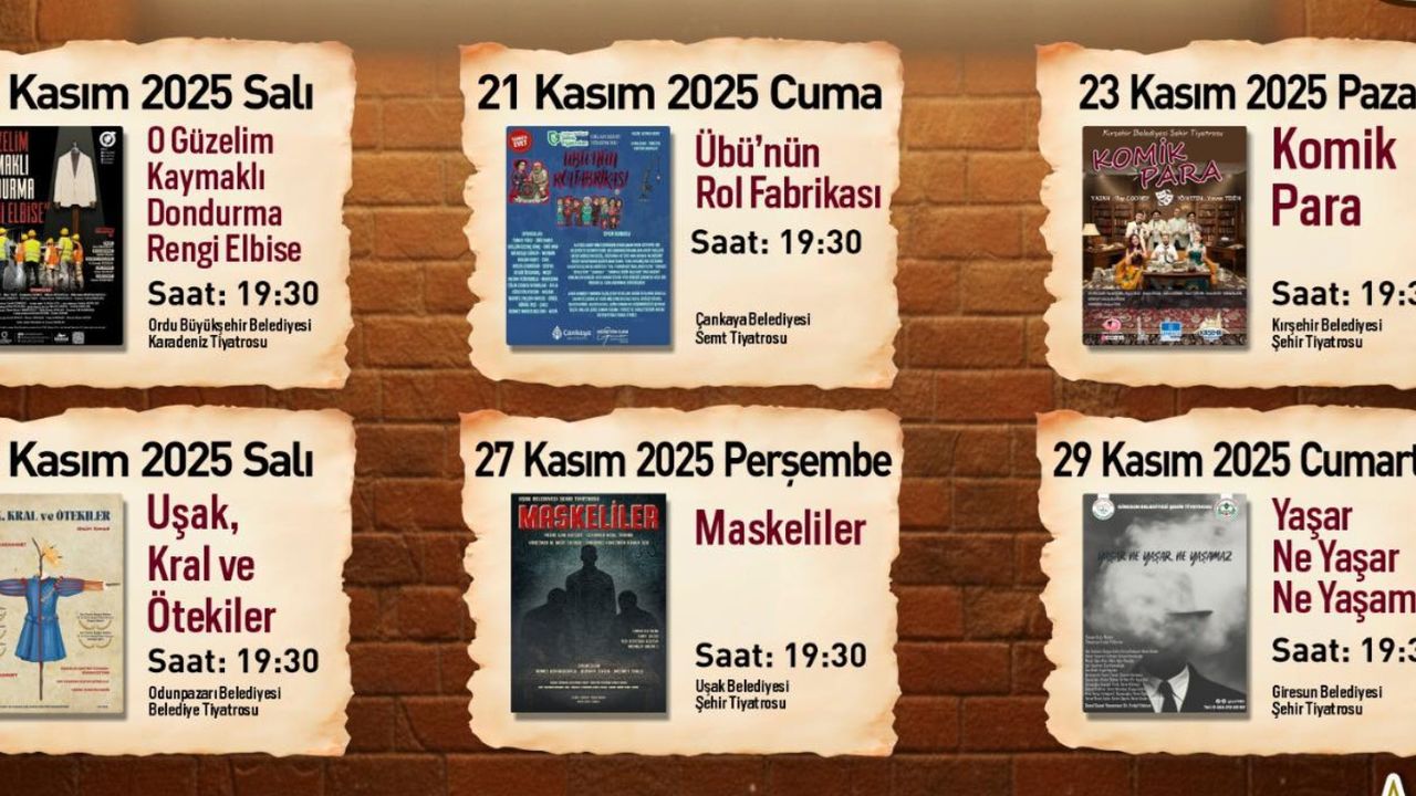 3. Tiyatro Festivali çerçevesinde Ordu Büyükşehir Belediyesi Karadeniz Tiyatrosu, Çankaya Belediyesi Semt Tiyatrosu, Kırşehir Belediyesi Şehir Tiyatrosu, Odunpazarı Belediyesi Belediye Tiyatrosu, Uşak Belediyesi Şehir Tiyatrosu ve Giresun Belediyesi Şehir Tiyatrosu performanslarını sergileyecek.