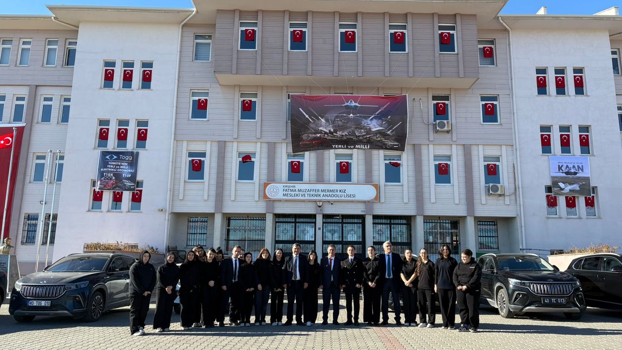 Kırşehir Fatma Muzaffer Mermer Kız Mesleki ve Teknik Anadolu Lisesi tarafından gerçekleştirilen etkinlik kapsamında Kırşehir’de bulunan TOGG markalı araçlar okulun bahçesinde bir araya geldi. Kırşehir Fatma Muzaffer Mermer Kız Mesleki ve Teknik Anadolu Lisesi’nde gerçekleştirilen etkinliğe Kırşehir Vali Yardımcıları İsmail Çetinkaya ve Alper Balcı, Kırşehir İl Milli Eğitim Müdürü Yasin Gülşen, öğretmenler ve öğrenciler katıldı.