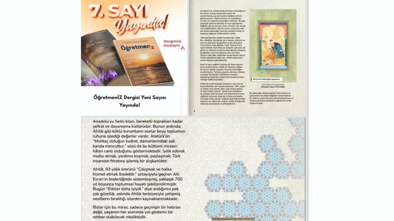 Fatma Muzaffer Mermer Anadolu Meslek ve Meslek Lisesi Türk Dili ve Edebiyatı öğretmeni Canan Köksal’ın kaleme aldığı “Ahilik” başlıklı yazı, Millî Eğitim Bakanlığı tarafından yayımlanan “Öğretmeniz Dergisi”nin 7. sayısında yer aldı.