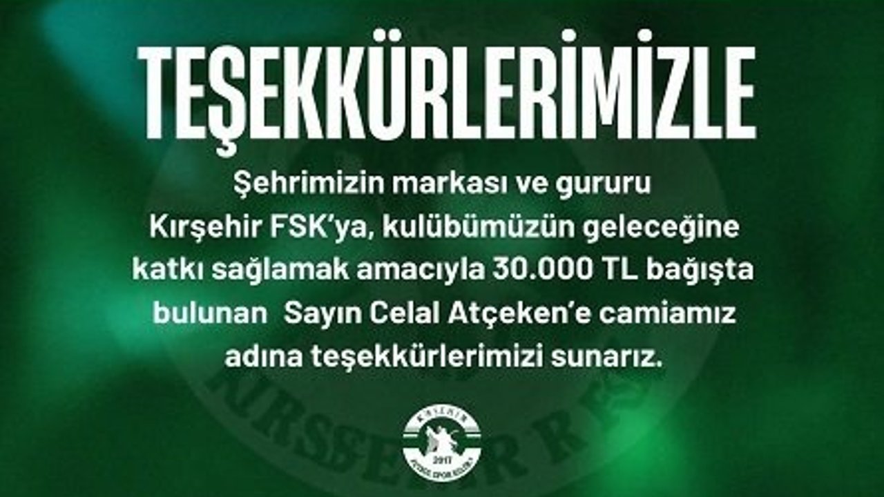 Kulüpten yapılan açıklamada, “Şehrimizin markası ve gururu Kırşehirspor’a, kulübümüzün geleceğine katkı sağlamak amacıyla 30.000 TL bağışta bulunan Sayın Celal Atçeken’e camiamız adına teşekkürlerimizi sunarız” ifadelerine yer verildi.