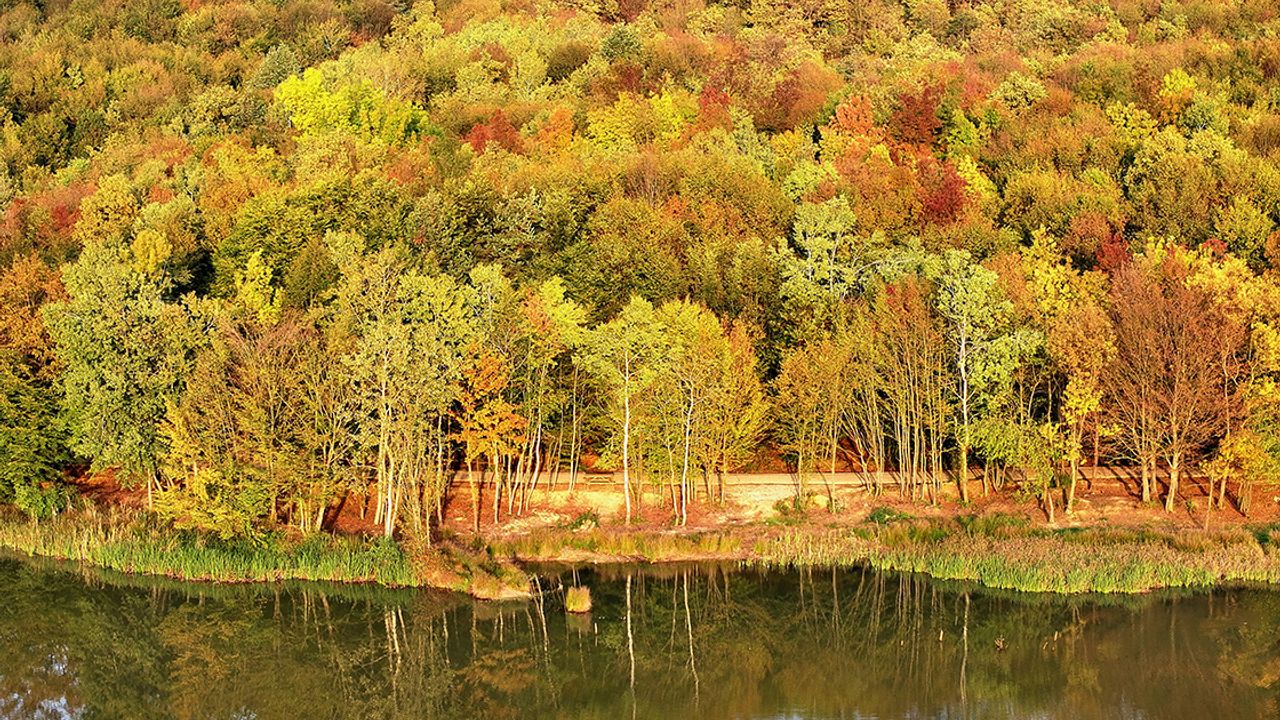 Düzce'deki Korugöl Tabiat Parkı, ziyaretçilerine sonbahar manzarası sunuyor.