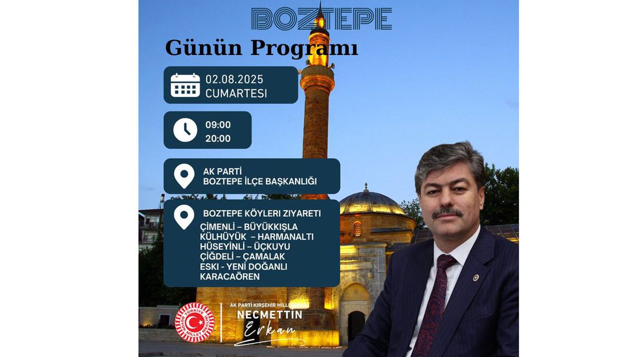 AK Parti Kırşehir Milletvekili Necmettin Erkan, 2 Ağustos Cumartesi günü Boztepe ilçesine bağlı köyleri kapsayan yoğun bir ziyaret programı gerçekleştirecek. Birlik ve beraberlik mesajı veren AK Parti Kırşehir Milletvekili Necmettin Erkan, bugün Boztepe köylerine program düzenleyeceğini duyurdu. Milletvekili Erkan köylerin ihtiyaçlarını ve sorunlarını yerinde dinleyecek. Muhtarların eşliğinde ziyaret gerçekleştirecek olan Milletvekili Erkan, saat 09.00’da başlayacağı programını saat 20.00’de sonlandıracak. AK Parti Boztepe İlçe Başkanlığında gerçekleştirilecek toplantının ardından Çimenli, Büyükkışla KülHüyük, Harmanaltı, Hüseyinli, Üçkuyu, Çiğdeli, Çamalak Eski, Yeni Doğanlı, Karacaören köylerini ziyaret edecek.