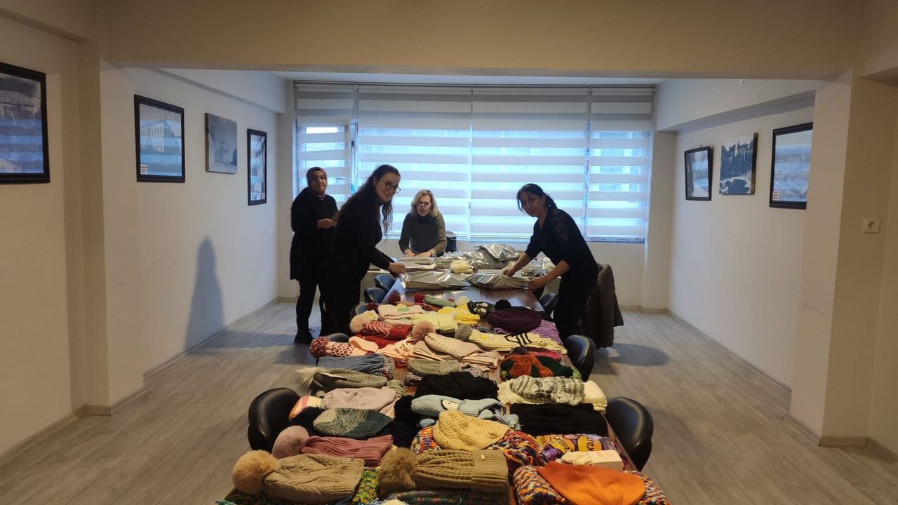 Kırşehir Kent Konseyi Kadın Meclisi öncülüğünde yürütülen sosyal sorumluluk projesi kapsamında öğrenciler için büyük bir özveriyle örülen atkı, bere ve eldivenler, Kent Konseyi binasında toplanmaya devam ediyor. Kadınların el emeğiyle hazırladığı bu kışlık ürünler, karne günü öğrencilere ulaştırılmak üzere özenle tasnif edilip paketleniyor.