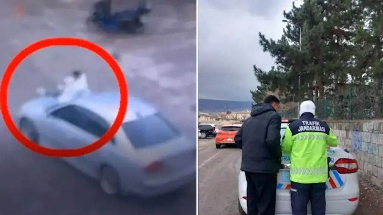 Güvenlik kamerasına yansıyan görüntüde, otomobilin motor kaputunda yolcu bulunduğu halde trafikte ilerlediği görüldü.