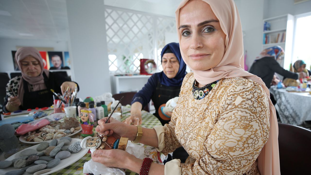 Tutkal ve silikonla yapıştırdıkları taşları seramik hamuruyla kaplayıp boya ve vernikle süsleyerek yöresel kıyafetli bebeklere dönüştürdüklerini anlatan Fakı, kurs sayesinde depremin olumsuz etkilerinden kurtulduğunu söyledi.