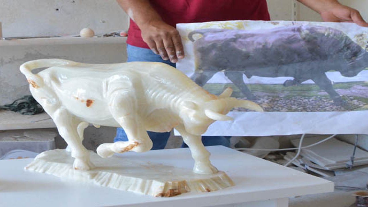 "Uygun bir Kırşehir oniks taşı seçtik. İşe başladık. Bitirmek uzun zamanımızı aldı. Oniks taşını ilk getirdiğimizde yaklaşık 200 kilogram civarındaydı. Günlerce yontarak şekil aldı. Boğa heykeli son aşamaya gelinceye kadar yüzde 70'e yakını fire oldu. Yüzde 30'luk kısmıyla boğa heykeli bir ayda tamamlandı. Uzun soluklu bir çalışma oldu. Oniks taşı işlemeciliği yontularak yapılan bir sanattır."
