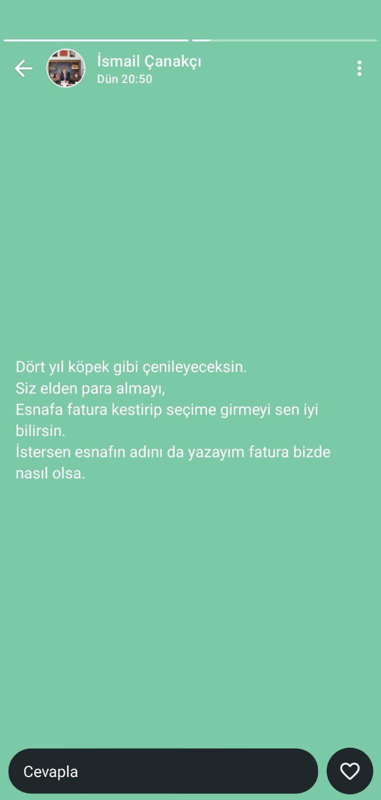 Ard arda paylaşım yapan Başkan Çanakçı, "Dört yıl k.... gibi çenileyeceksin. Siz elden para almayı, esnafa fatura kestirip seçime girmeyi sen iyi bilirsin. İstersen esnafın adını da yazayım fatura bizde nasıl olsa" ifadelerini kullandı.